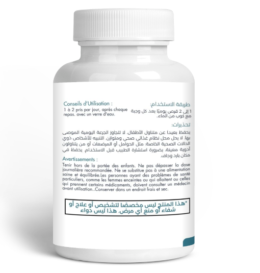 Complément alimentaire conçu pour soutenir la santé cérébrale et la concentration, contenant des ingrédients naturels qui améliorent la capacité de réflexion et les performances mentales, incluant vitamines, minéraux et acides aminés.